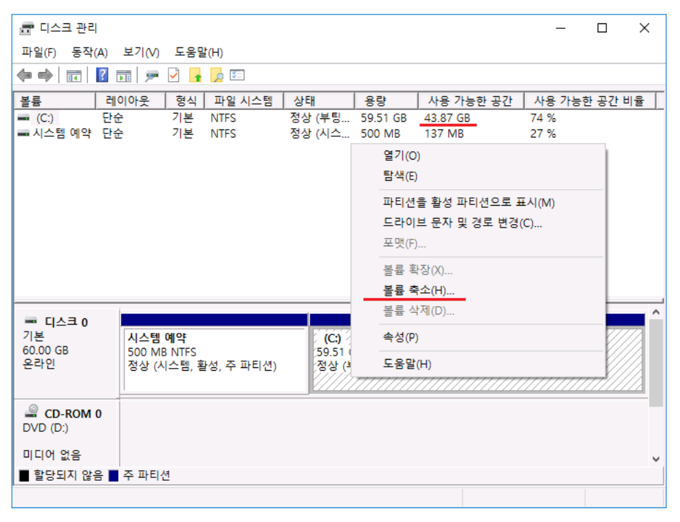C드라이브에서 마우스 오른쪽을 누르면 볼륨 축소라고 보이실 거에요. 클릭!