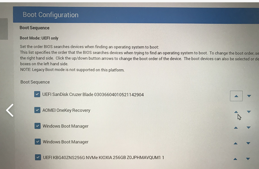 Usb(Sandisk)의 Boot Sequence를 오른쪽 화살표를 이용하여 가장 위로 올려줍니다.