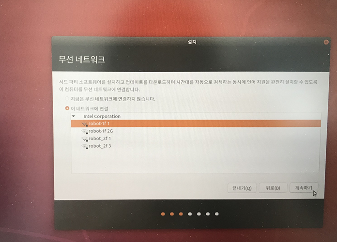 검은 화면이 나타나면, Ubuntu Install을 눌러주시고 다음 화면에서 와이파이를 연결해주세요.
