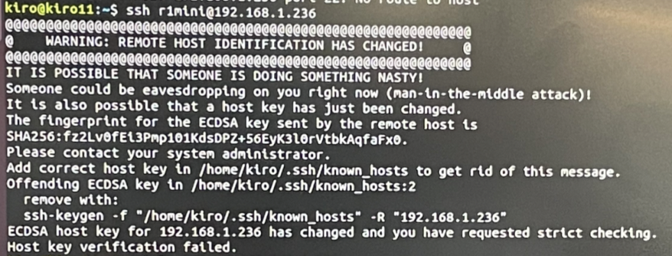 Host key verification failed. 이라며 뭔가 Key에 문제가 생겼다는 것을 알 수 있죠.